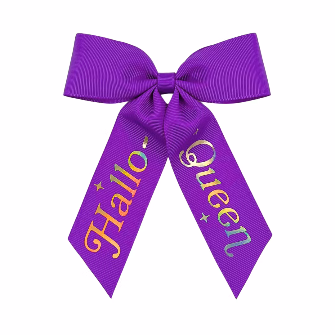 Handgjord hårrosett med guldtext och franskt metallspänne på baksidan.