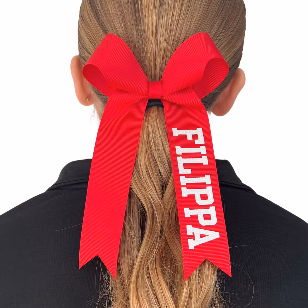 Cheerrosetten är av mjuk modell med tofs och dekorerad med ett glittrande namntryck.