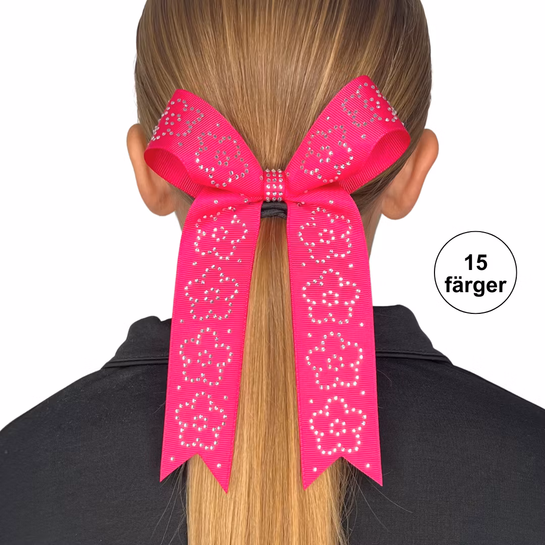 Handgjord cheerleadingrosett i klassisk collage bow-modell med hårsnodd, dekorerad med vackert glittrande strass (rhinestones).