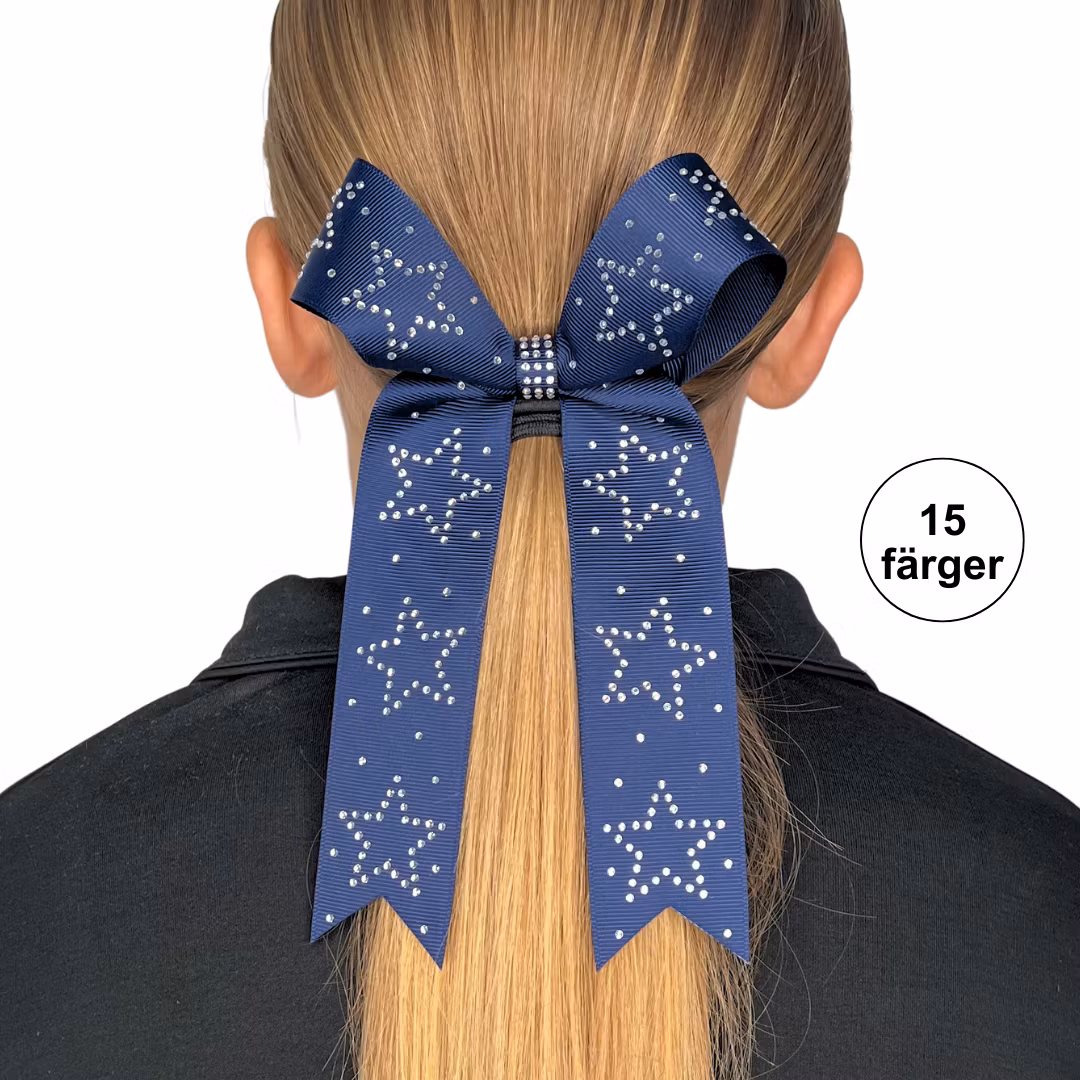 Handgjord cheerleadingrosett i klassisk collage bow-modell med hårsnodd, dekorerad med vackert glittrande strass (rhinestones).