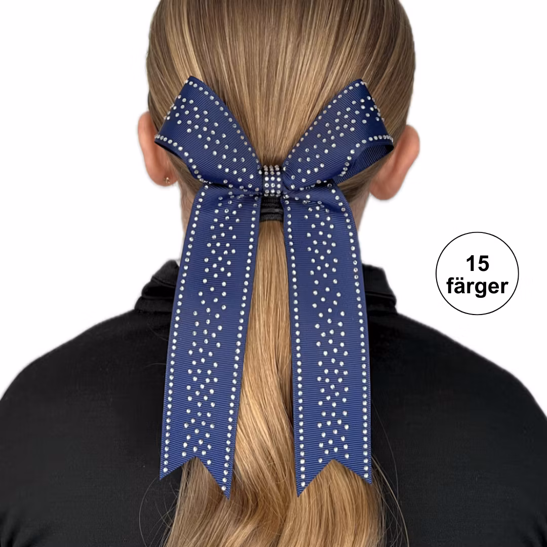 Handgjord cheerleadingrosett i klassisk collage bow-modell med hårsnodd, dekorerad med vackert glittrande strass (rhinestones).