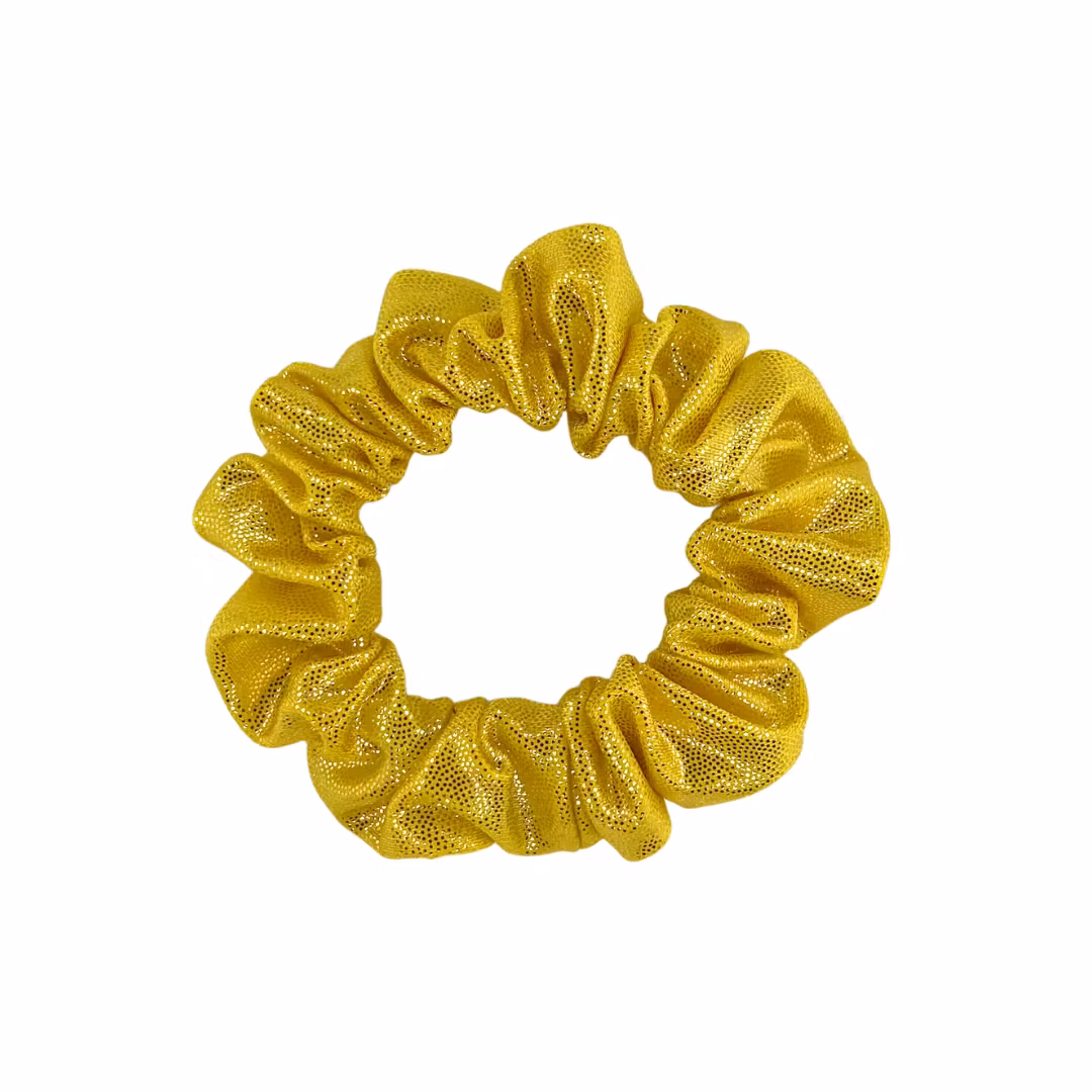 Handgjord scrunchie i glittrande tyg. Sätt upp som en vanlig tofs eller tillsammans med en hårdonut. Den perfekta scrunchien för cheerleading, konståkning, gymnastik och fest.