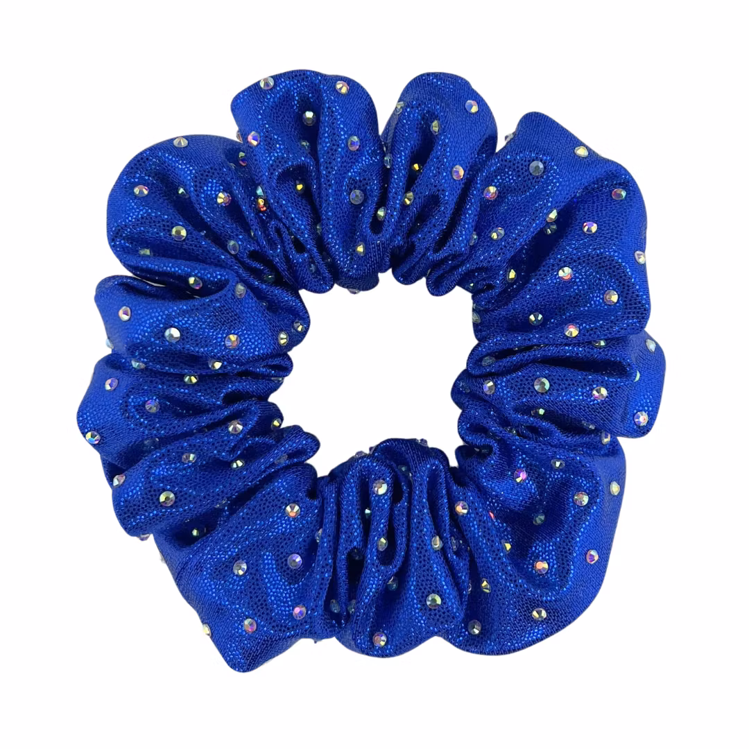 Handgjord scrunchie dekorerad med glittrande strasstenar. Sätt upp som en vanlig tofs eller tillsammans med en hårdonut. Den perfekta scrunchien för cheerleading, konståkning, gymnastik och fest.