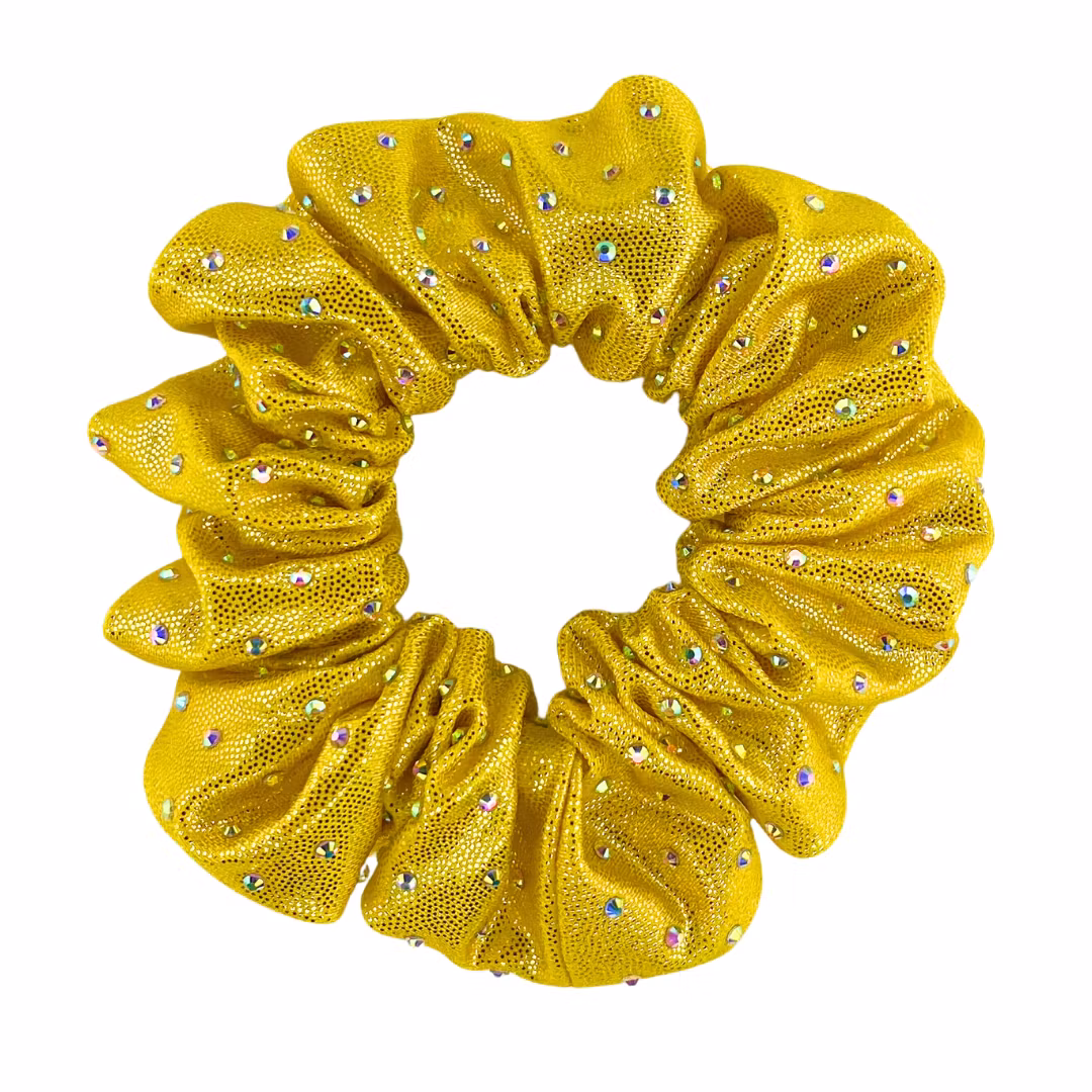 Handgjord scrunchie dekorerad med glittrande strasstenar. Sätt upp som en vanlig tofs eller tillsammans med en hårdonut. Den perfekta scrunchien för cheerleading, konståkning, gymnastik och fest.