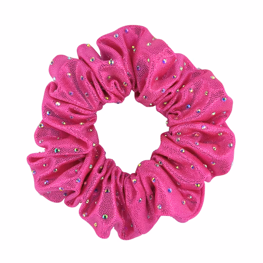 Handgjord scrunchie dekorerad med glittrande strasstenar. Sätt upp som en vanlig tofs eller tillsammans med en hårdonut. Den perfekta scrunchien för cheerleading, konståkning, gymnastik och fest.