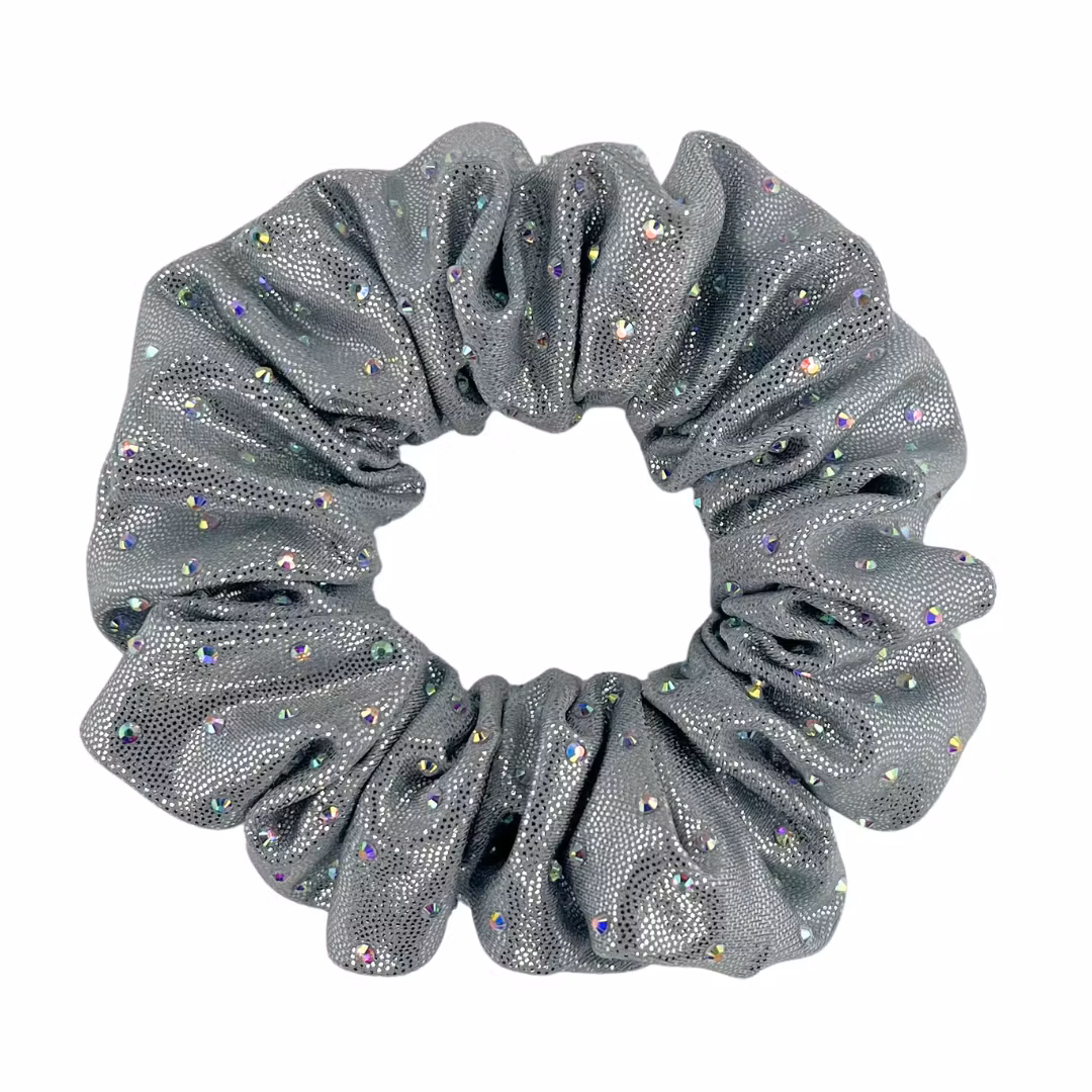 Handgjord scrunchie dekorerad med glittrande strasstenar. Sätt upp som en vanlig tofs eller tillsammans med en hårdonut. Den perfekta scrunchien för cheerleading, konståkning, gymnastik och fest.