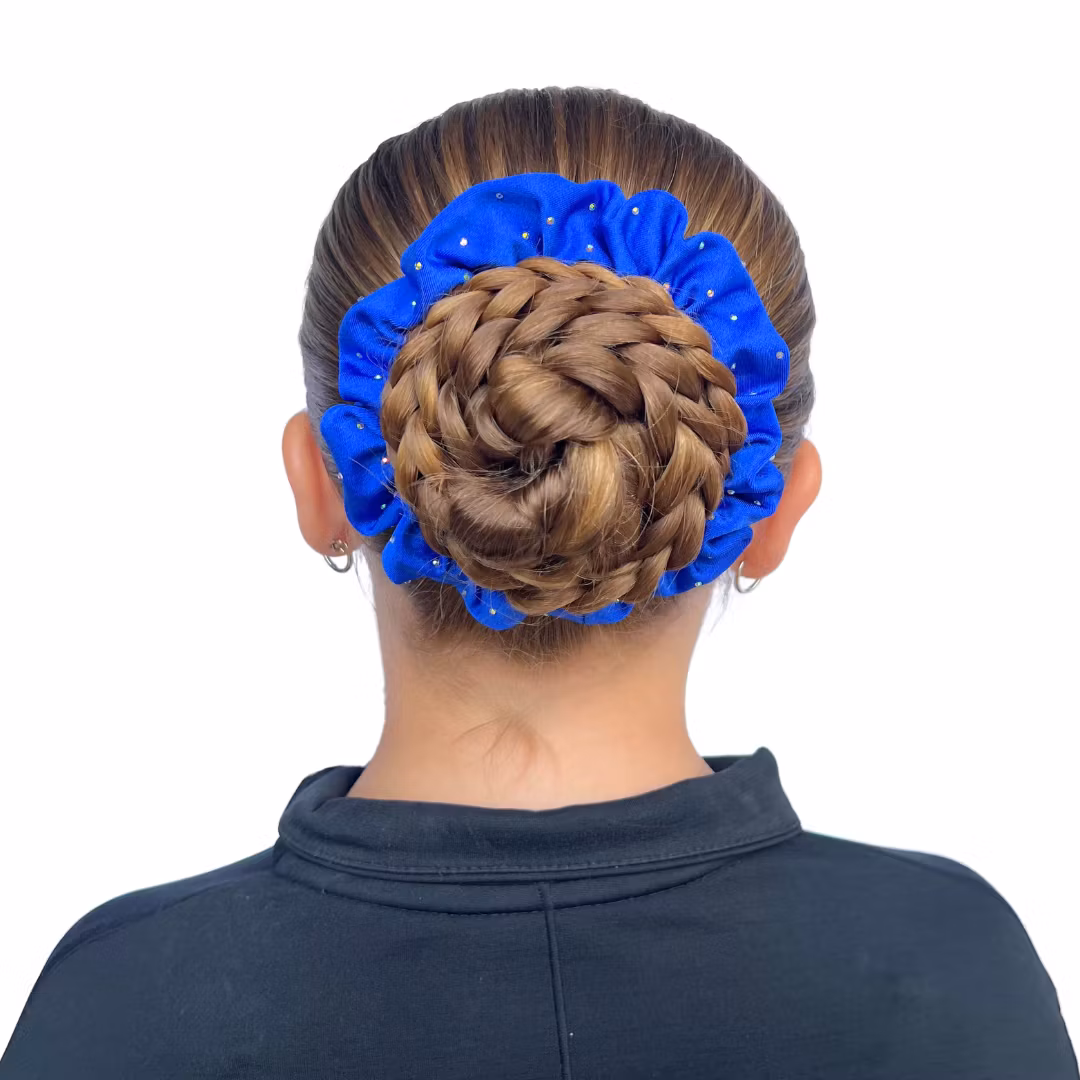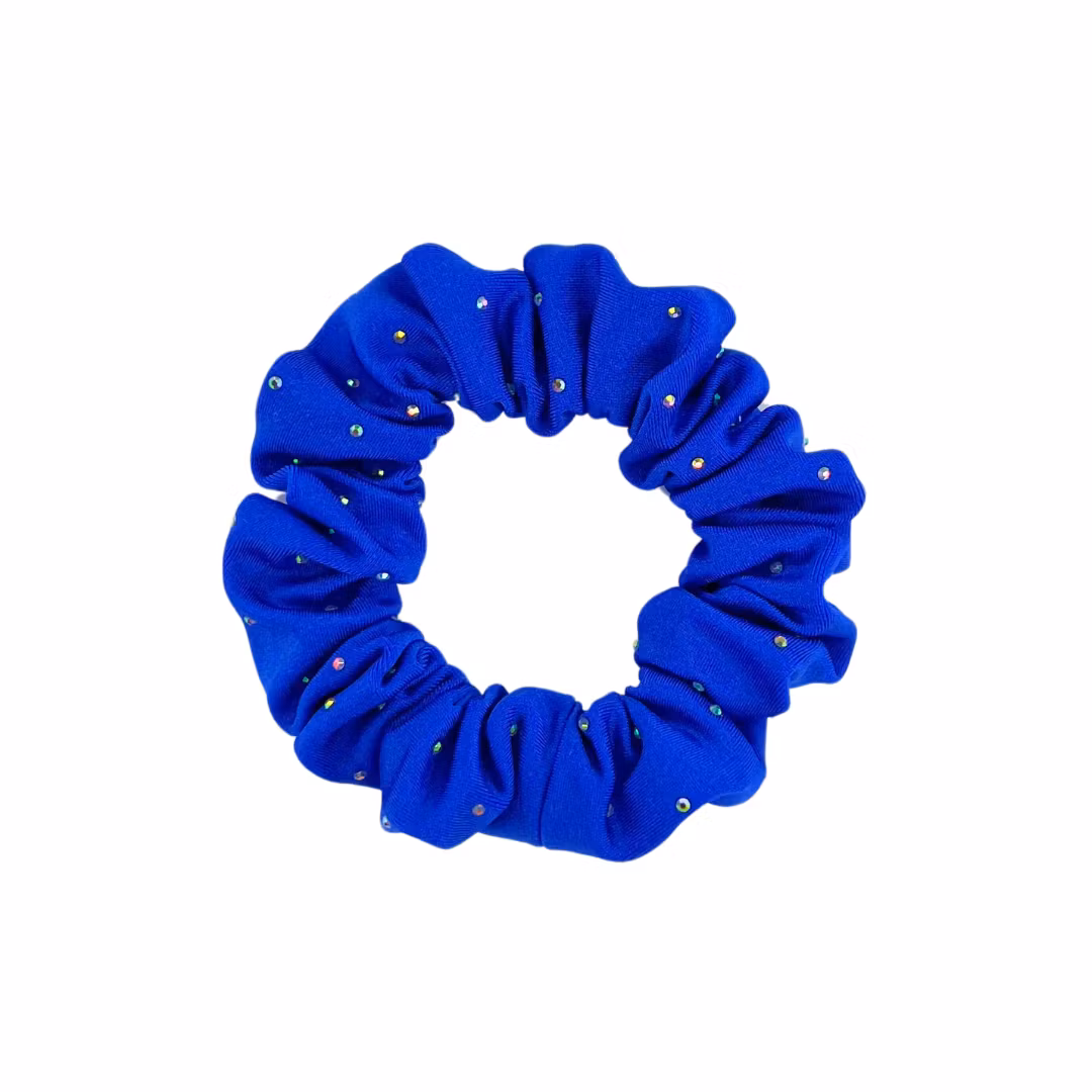 Handgjord scrunchie dekorerad med glittrande strasstenar. Sätt upp som en vanlig tofs eller tillsammans med en hårdonut. Den perfekta scrunchien för cheerleading, konståkning, gymnastik och fest.