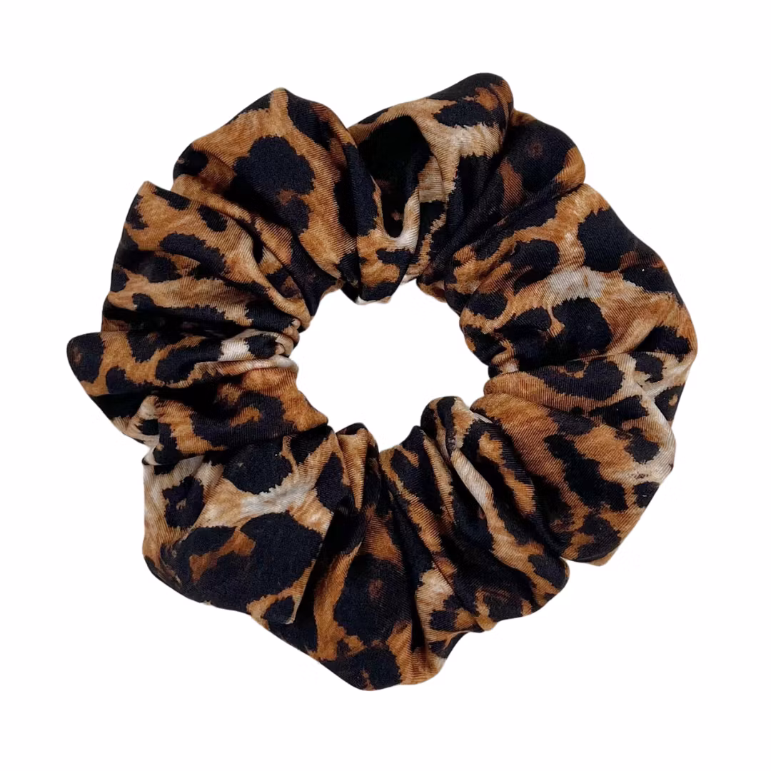 Handgjord scrunchie i leopardmönstrat tyg. Sätt upp som en vanlig tofs eller tillsammans med en hårdonut.